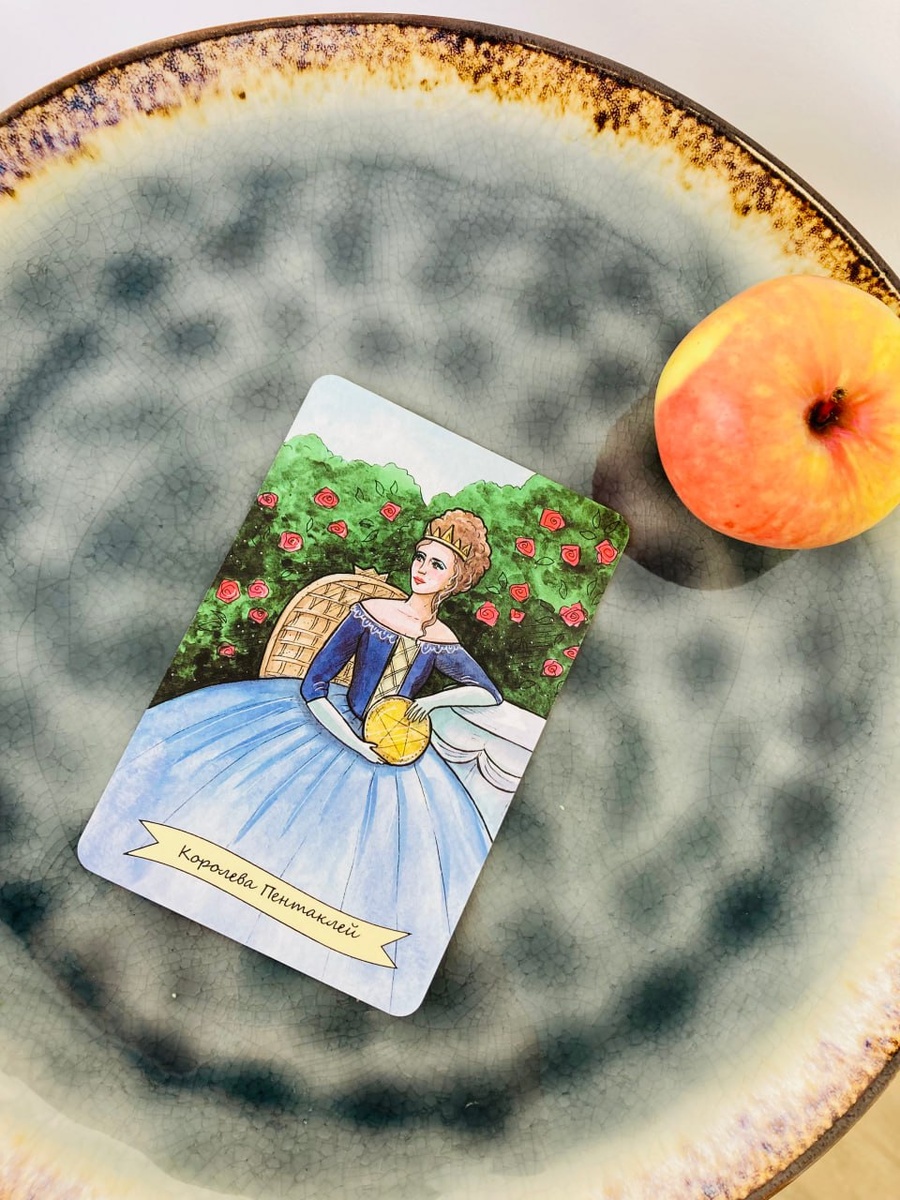✨Карта Дня - Королева Пентаклей✨ С утра ты открываешь глаза — и, вместе с тобой в комнату заходит Королева Пентаклей. Нет, не с короной и на подушках, а с запахом свежеиспечённого хлеба, лёгкими нотками корицы на пальцах и милой улыбкой. Она умеет замечать то, что другие считают мелочами: как солнечный луч пробивается сквозь деревья, как чай в кружке остывает именно до той температуры, когда его хочется пить залпом. Куда бы ты ни пошла сегодня — Королева с тобой. В магазине у кассы она подскажет рецепт пирога, а в пробке между делами тихонько прошепчет: «Ты в порядке, просто позволь себе идти медленнее». У неё нет стандарта счастья — она делает каждый свой день шедевром. В её руках даже самая скучная задача превращается в маленький праздник: разложить вещи по полкам — и вдруг всплывает нитка воспоминаний про радость, тепло и уют. А вечером, когда сбрасываешь с плеч заботы дня, Королева Пентаклей возьмет твою руку на несколько секунд ― напоминание, что в мире есть место простым чудеса