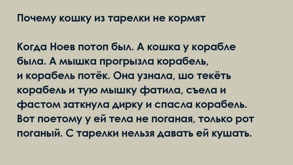Почему кошку из тарелки не кормят #фольклор_ЗЕЛО Существует несколько версий, кто спас человечество в Ковчеге, это может быть кошка, заткнувшая дыру хвостом (в Откровении Мефодия Патарского она появляется от чихания льва), собака своим носом (поэтому он мокрый), часто - змея, а иногда спасительницей выступает жена Ноя (поэтому женские локти всегда холодные).