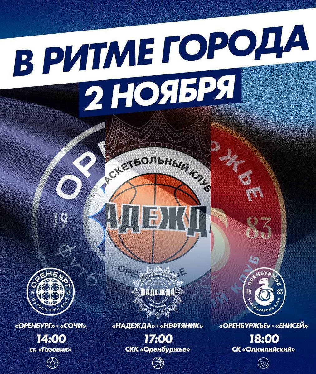 В РИТМЕ ГОРОДА!🔥 2 ноября Оренбург станет центром спортивных событий — сразу три профессиональных клуба проведут домашние матчи! - ⚽️ ФК «Оренбург» встретится с «Сочи» — важнейшая игра в Российской Премьер-лиге. - 🏀 БК «Надежда» примет «Нефтяник-Титан» — сложнейшая игра в Премьер-лиге ! - 🏐 ВК «Оренбуржье» сыграет с «Енисеем» — принципиальный матч с прямым конкурентом Суперлиги Чемпионата России. Приглашаем всех болельщиков поддержать наши команды в этот яркий спортивный день! Вместе мы создадим неповторимую атмосферу и поможем командам одержать победы! #ВРитмеГорода