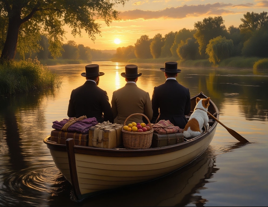 Книга рассказывает о путешествии трёх друзей и фокстерьера в четырёхвёсельной лодке по Темзе.С этим связано множество юмористических историй, рассуждений, воспоминаний, которые настигли каждого из них в этой нелегкой дороге.