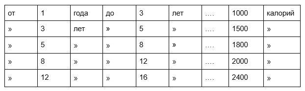 Детское население по калорийным тратам распределяется на следующие возрастные группы: