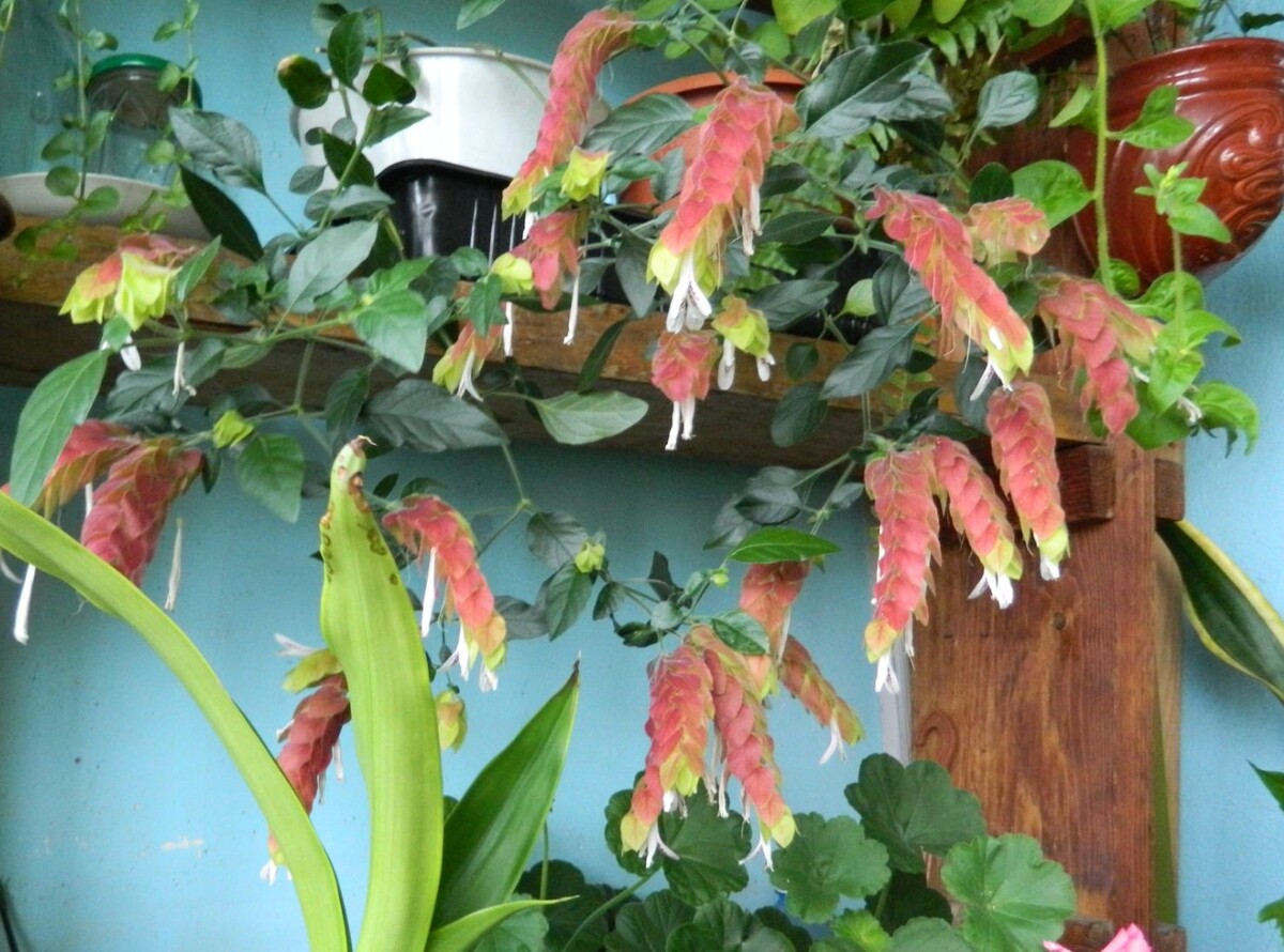Сегодня расскажу о своем любимом цветке, который я почти никогда не встречала ни у кого дома. Этот цветок не обладает пышной красотой, но он так необычен и ярок, что во время цветения от него трудно оторвать взгляд. Это белопероне капельная – вот и название у него тоже непростое. У меня белопероне появилась несколько лет назад и сразу стала любимицей. У себя на родине – в тропической Мексике, белопероне растет в виде сильно раскидистого кустарника до 1 м высотой, а в комнатных условиях это небольшое растение, которое может расти кустиком или в виде ампельного растения, также из него можно сформировать куст на штамбе. Самое необычное у белопероне – ее цветки, точнее соцветия, которые настолько оригинальны, что из-за них растению дали такие названия как раковая шейка, жар-птица. Их колосовидные соцветия имеют прицветники 2-3 см длиной, они направлены вниз и закрывают цветочки с пестиками и тычинками. Расцветка цветов может быть красной, оранжевой или желтой, иногда комбинированной. Сна