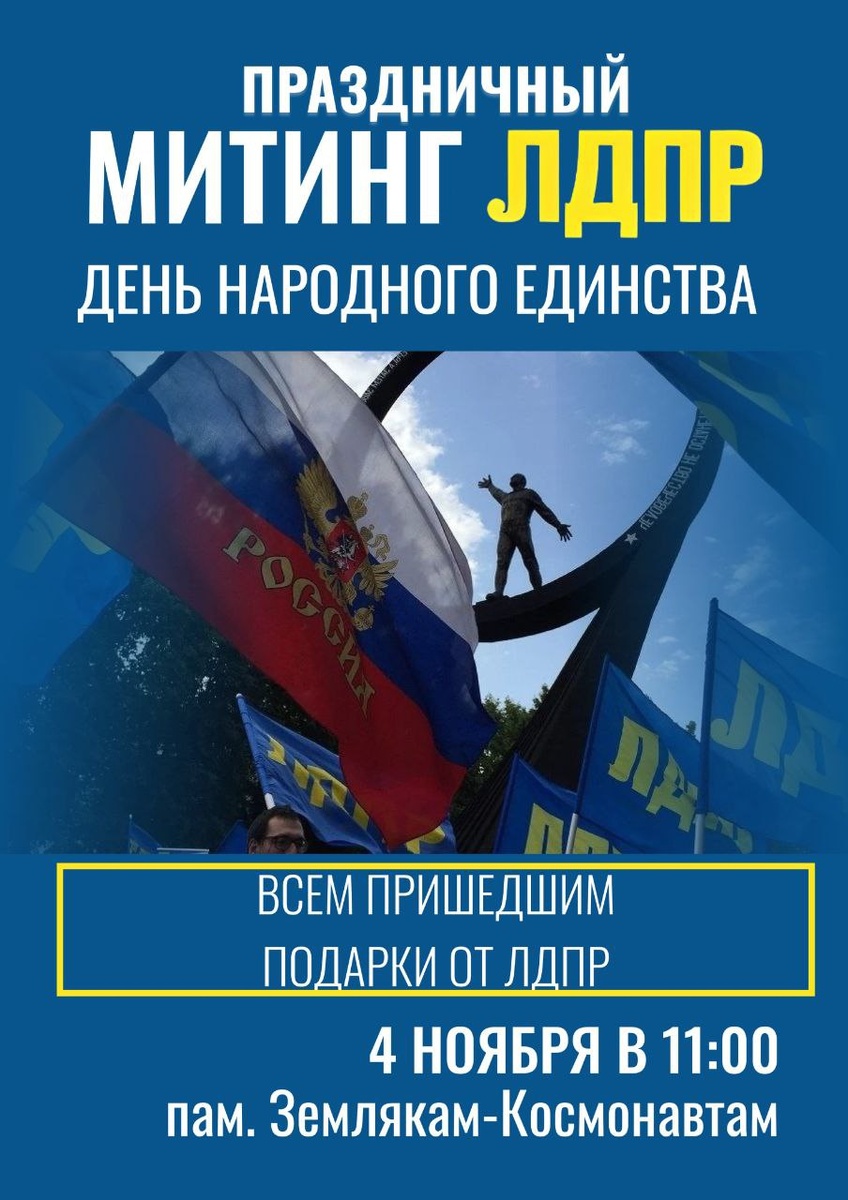 Вместе мы сила! Приглашаем на митинг в честь Дня народного единства! Дорогие друзья, земляки! Приглашаем вас стать частью большого и важного праздника – Дня народного единства! Этот день символизирует сплоченность, веру в нашу страну и великую историю России. Ждем вас 4 ноября в 11:00 у памятника Землякам-космонавтам в Калининграде. В программе мероприятия: 🔹Праздничные выступления депутатов ЛДПР. 🔹Открытый диалог на самые острые и актуальные темы, которые волнуют каждого из нас. 🔹Мы не просто говорим о проблемах – мы предлагаем решения и готовы отстаивать ваши интересы! Всем пришедшим – гарантированы подарки от ЛДПР! Приходите всей семьей! Давайте вместе продемонстрируем наше единство, силу духа и веру в будущее России! Дата: 4 ноября Время: 11:00 Место: Памятник Землякам-космонавтам, Калининград. ЛДПР - Слышим каждого!