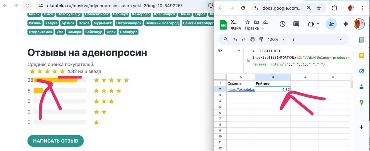 🧩 Как достать рейтинг товара с сайта через IMPORTXML Друзья, привет! Некоторые сайты можно парсить прямо из Google Таблиц с помощью IMPORTXML. Задача Из страницы: https://okapteka.ru/moskva/adyenoprosin-susp-ryekt-29mg-10-549226/ нужно достать рейтинг товара (например, 4.82 из 5 звезд). В коде страницы нужный элемент выглядит так: <div class="product-reviews__rating">4.82 из 5 звезд</div> 🧠 XPath-запрос Чтобы достать эти данные, используем XPath: //div[@class='product-reviews__rating'] Разбираем: 1. // - ищем в любом месте документа 2. div - тип элемента, который ищем 3. [@class='product-reviews__rating'] - фильтруем: берём только те div, где атрибут class равен "product-reviews__rating" Формула в Google Таблицах =--SUBSTITUTE(INDEX( SPLIT(IMPORTXML(A2;"//div[@class='product-reviews__rating']");" "); 1); ".";",") Формула пошагово: 1. IMPORTXML - тянет содержимое <div> (например, "4.82 из 5 звезд") 2. SPLIT(...;" ") - разбивает по пробелам - {"4.82" \ "из" \ "5" \ "звезд"}