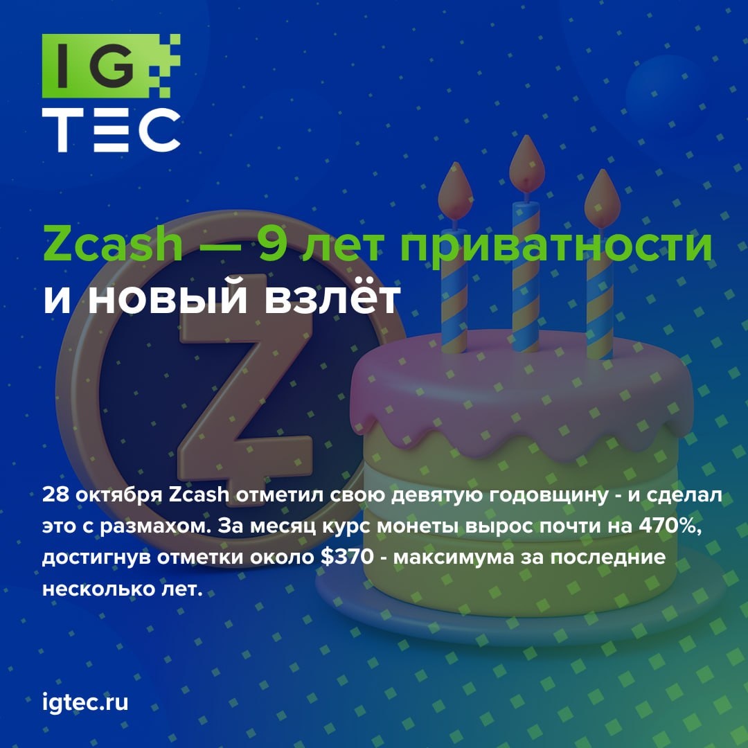 🎉Zcash — 9 лет приватности и новый взлёт 28 октября Zcash отметил свою девятую годовщину - и сделал это с размахом. За месяц курс монеты вырос почти на 470%, достигнув отметки около $370 - максимума за последние несколько лет. Zcash - одна из старейших и самых известных анонимных криптовалют, появившихся ещё в 2016 году. В отличие от биткоина, она позволяет скрывать отправителя, получателя и сумму транзакции, сохраняя при этом возможность верификации через zk-SNARK - передовую технологию нулевого разглашения. 👀На фоне нового интереса к приватности и децентрализации рынок вспомнил о «старых» проектах, и именно Zcash стала главным героем этого тренда. 📊Эксперты спорят: это временный памп или начало нового цикла для приватных монет. Но факт остаётся фактом - интерес к ZEC стремительно растёт, а вместе с ним и хешрейт сети. 💰Для тех, кто хочет майнить Zcash выгодно, в IGTEC есть выгодное спецпредложение на Antminer Z15e в наличии в Москве. За подробностями обращайтесь к нашему мен