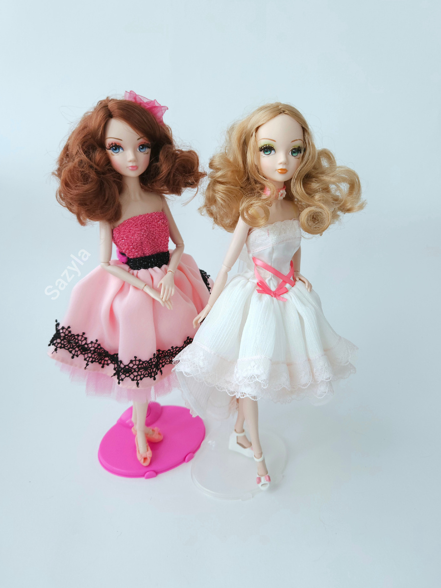 Платье выполнено из “корсетного” верха из объёмной ткани с блёстками, а юбка из струящегося шифона, обшитого вязаным кружевом (уж не с этих ли кукол началась моя неимоверная любовь к шифону, как к материалу для одежды кукол 🤔). Нижняя юбка сделана из плотной сетки, чтобы держать объем.