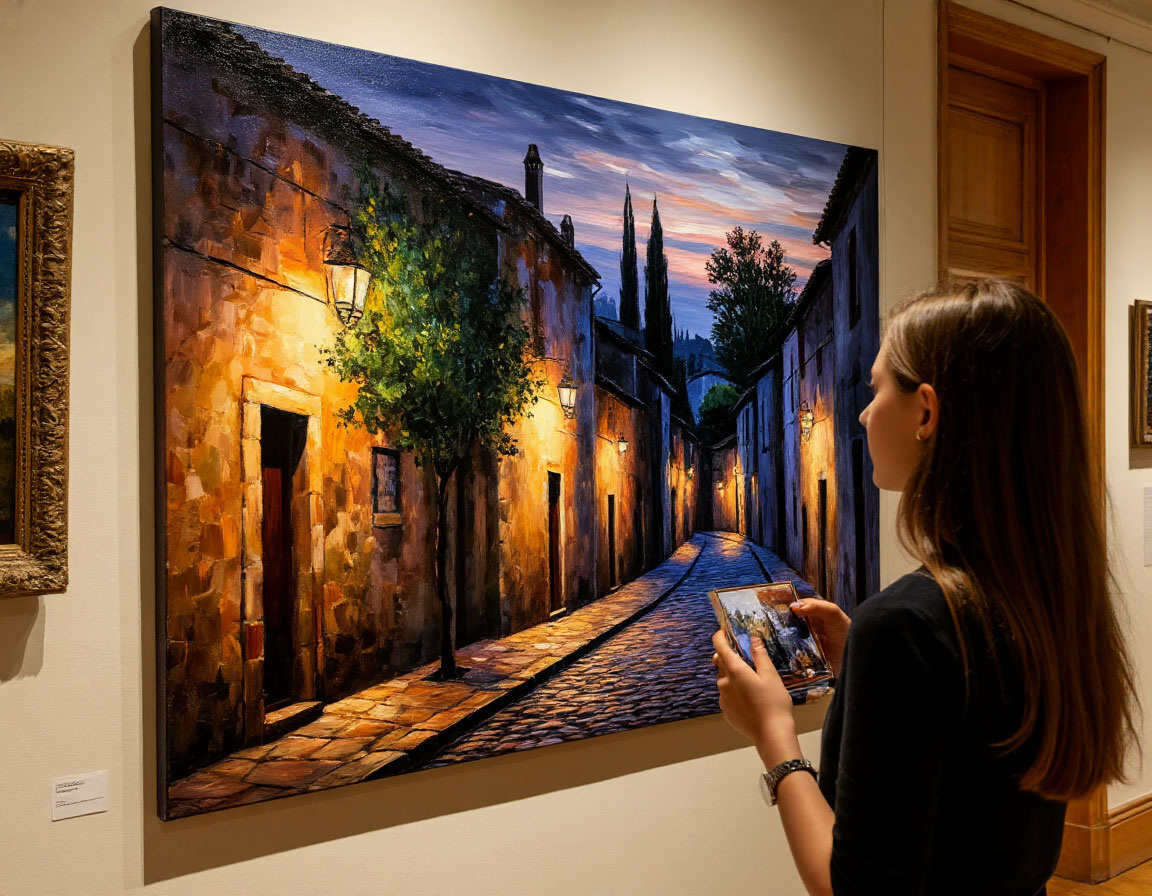 Они остановились перед картиной, изображающей старинный городской пейзаж. Узкие улочки, мощенные камнем, дома с черепичными крышами, силуэты деревьев на фоне вечернего неба. Картина была написана в стиле, который Станислав Владиленович определил как поздний импрессионизм, с характерной игрой света и тени.