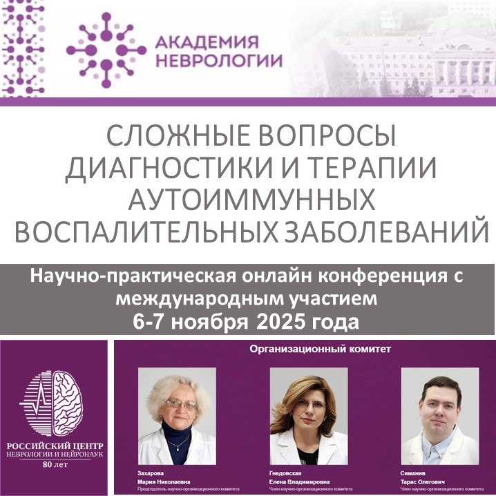 Уважаемые коллеги! 6-7 ноября 2025 г. состоится онлайн-конференция «Сложные вопросы диагностики и терапии аутоиммунных воспалительных заболеваний» Онлайн-конференция «Сложные вопросы диагностики и терапии аутоиммунных воспалительных заболеваний центральной нервной системы» посвящена современным подходам к ведению пациентов с рассеянным склерозом, оптиконевромиелитом, аутоиммунными энцефалитами и другими редкими патологиями. Ключевые темы конференции: дифференциальная диагностика аутоиммунных поражений ЦНС: клинические, лабораторные и инструментальные критерии; современные методы нейровизуализации и биохимические маркеры в ранней диагностике; инновационные стратегии иммуносупрессивной и биологической терапии; предикторы ответа на лечение и персонализированный подход к выбору терапии; долгосрочное наблюдение и реабилитация пациентов с аутоиммунными заболеваниями ЦНС. Подробнее на сайте https://myneurology.ru/07112025