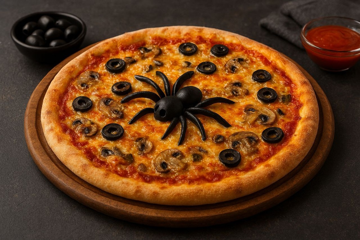 2. Пицца-паук Ингредиенты: - Основа для пиццы - Томатный соус - Сыр - Маслины - Любая начинка Рецепт: 1. Собери пиццу как обычно. 2. Из маслин сделай пауков: половинка - тело, полоски - лапки. 3. Выпекай до готовности.