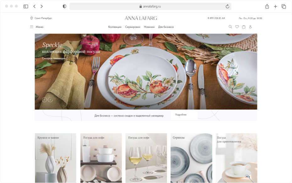 Бренд Anna Lafarg работает на территории России и стран СНГ с 1998 года. За это время компания выросла в одного из крупнейших оптовых продавцов посуды, подарков и предметов интерьера. Ассортимент включает как функциональные предметы для сервировки и кухни, так и интерьерные аксессуары. Клиенты бренда — оптовые покупатели, розничные сети и частные ценители красивого дома.В 2024 году у компании был действующий интернет-магазин, который постепенно перестал отвечать потребностям бизнеса: дизайн устарел, а оптовые процессы не поддерживали новый уровень работы с партнерами.