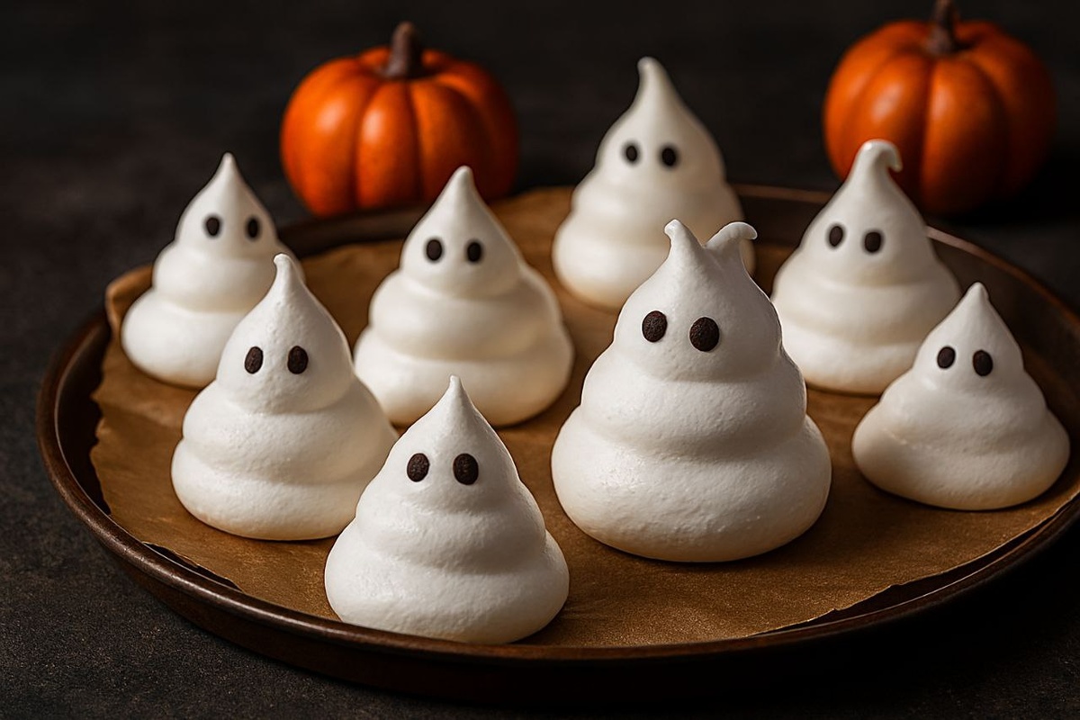 3. Призрачные безе Ингредиенты: - Белки 2 шт - Сахар 100 г - Шоколад для глаз Рецепт: 1. Взбей белки с сахаром до пиков. 2. Отсадь «призраков» на пергамент. 3. Выпекай при 100-110°C ~1,5 ч. 4. Нарисуй глазки растопленным шоколадом.