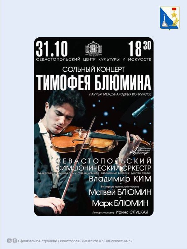 Подводим итоги розыгрыша! Дарим 2 билета на сольный концерт Тимофея Блюмина и Севастопольского симфонического оркестра @KbsjxuxbbUbbTROONBGCDGDbdndnxgft Благодарим всех за участие! Следите за новостями— впереди еще много интересных мероприятий.