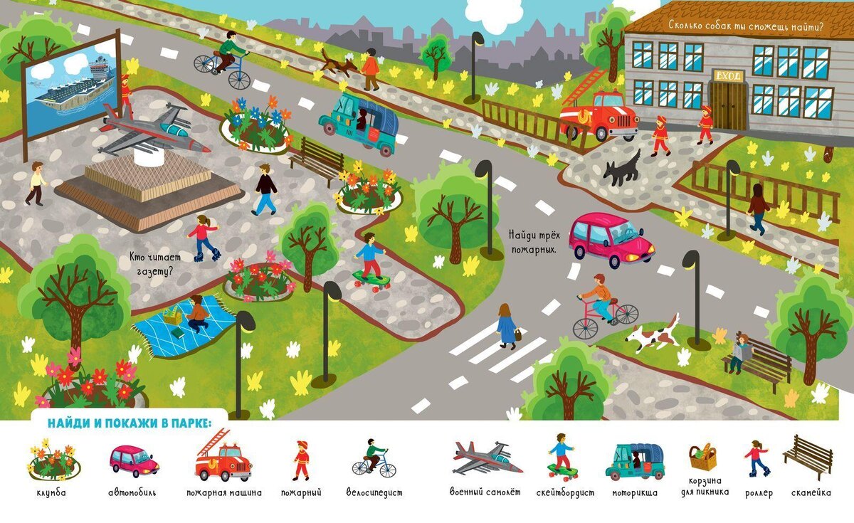 Взрослый предлагает ребенку рассмотреть страницу виммельбуха и назвать игры, в которые играют изображенные на ней персонажи.