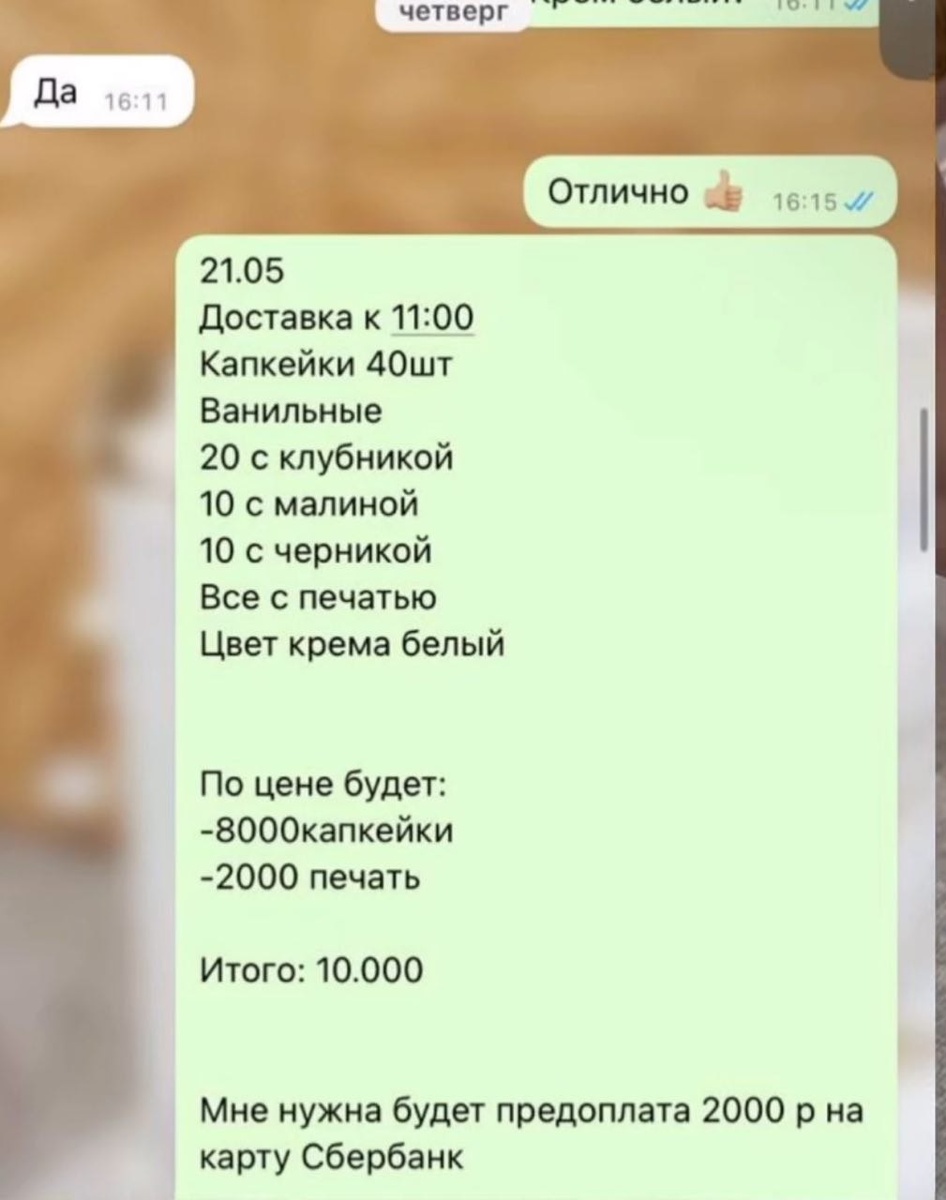 "Здравствуйте! Хочу рассказать, как я облажалась и потеряла 10 тыс. В прошлом году ко мне обратились с корпоративным заказом на капкейки. Вроде бы мы все обсудили: начинку, украшение, но оказалось, допустила ошибку. Вместо ванильных капкейков (которые нужно было сделать), я себе в блокнот записала ШОКОЛАДНЫЕ. Но это еще не все. Заказчица хотела не просто ванильные капкейки с клубничной начинкой, но и украшение сверху КЛУБНИКОЙ, то есть, чтобы помимо логотипа на шапочке капкейка была ягода клубники. Заказчица сказала, что это типа "логично". Если внутри клубника, то снаружи она тоже должна быть. Для нее это казалось логичным и понятным настолько, что мне она об этом ничего не сказала. Типа на странице очень много примеров работ в таком стиле, украшенных ягодами. И , по ее словам, наверное, это не мои работы, а чужие, если в этот раз я сделала по-другому. Но на самом деле даже в переписке видно, что мы договаривались об оформлении только логотипом, поэтому ничего не "логично". И если