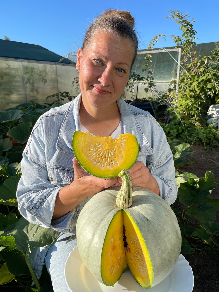 К новому сезону хочу рассказать о своей любимой тыкве — Ажур медовая. Это среднеспелый сорт, созревающий за 110-125 дней. Растение мощное, с длинными плетями. Плоды слабосплюснутые, светло-серые, без узоров, с упругой кожистой коркой, весят 5-9 кг. Мякоть ярко-желтая, содержит 6-8% сахаров и 6 мг каротина, сочная и вкусная. Преимущества сорта: устойчивость к засухе, хорошая транспортабельность, длительное хранение, отличные вкусовые и диетические свойства.