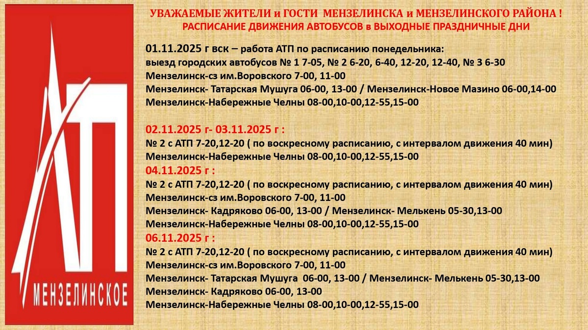 ❗🚌 Расписание движения автобусов ООО "Мензелинское АТП" в выходные праздничные дни