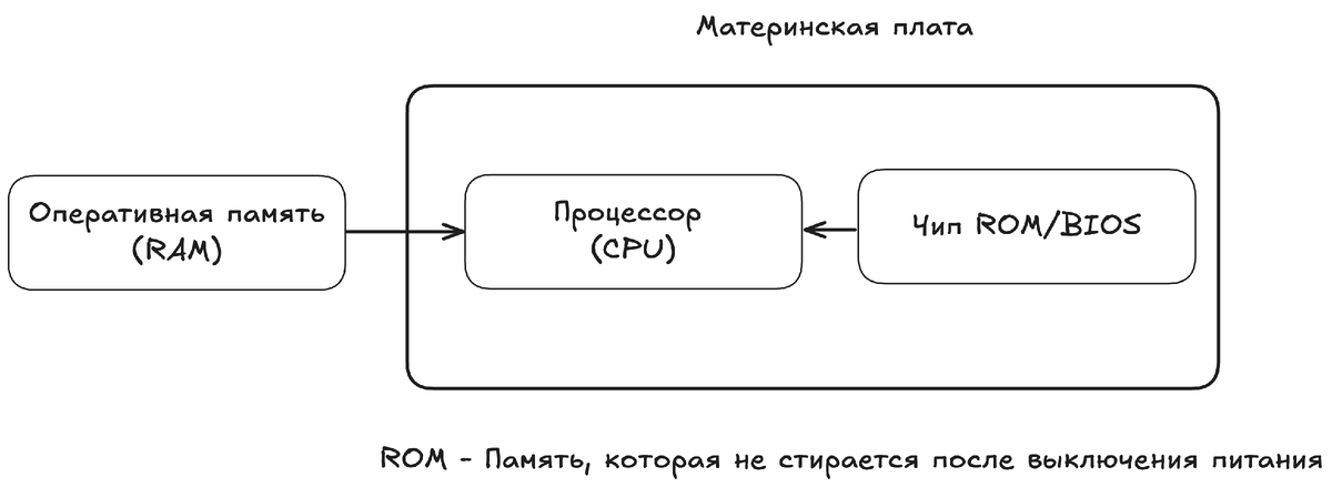 ROM (Read-Only Memory) — Постоянное Запоминающее Устройство (ПЗУ). Это особый тип памяти. В отличие от оперативной памяти (ОЗУ), которая полностью очищается при выключении питания, память ROM не стирается. Информация в нее «вшита» на заводе и хранится там постоянно, годами. Её нельзя изменить простой программой, поэтому она называется «постоянной» или «только для чтения». Именно в этой памяти и хранится BIOS.