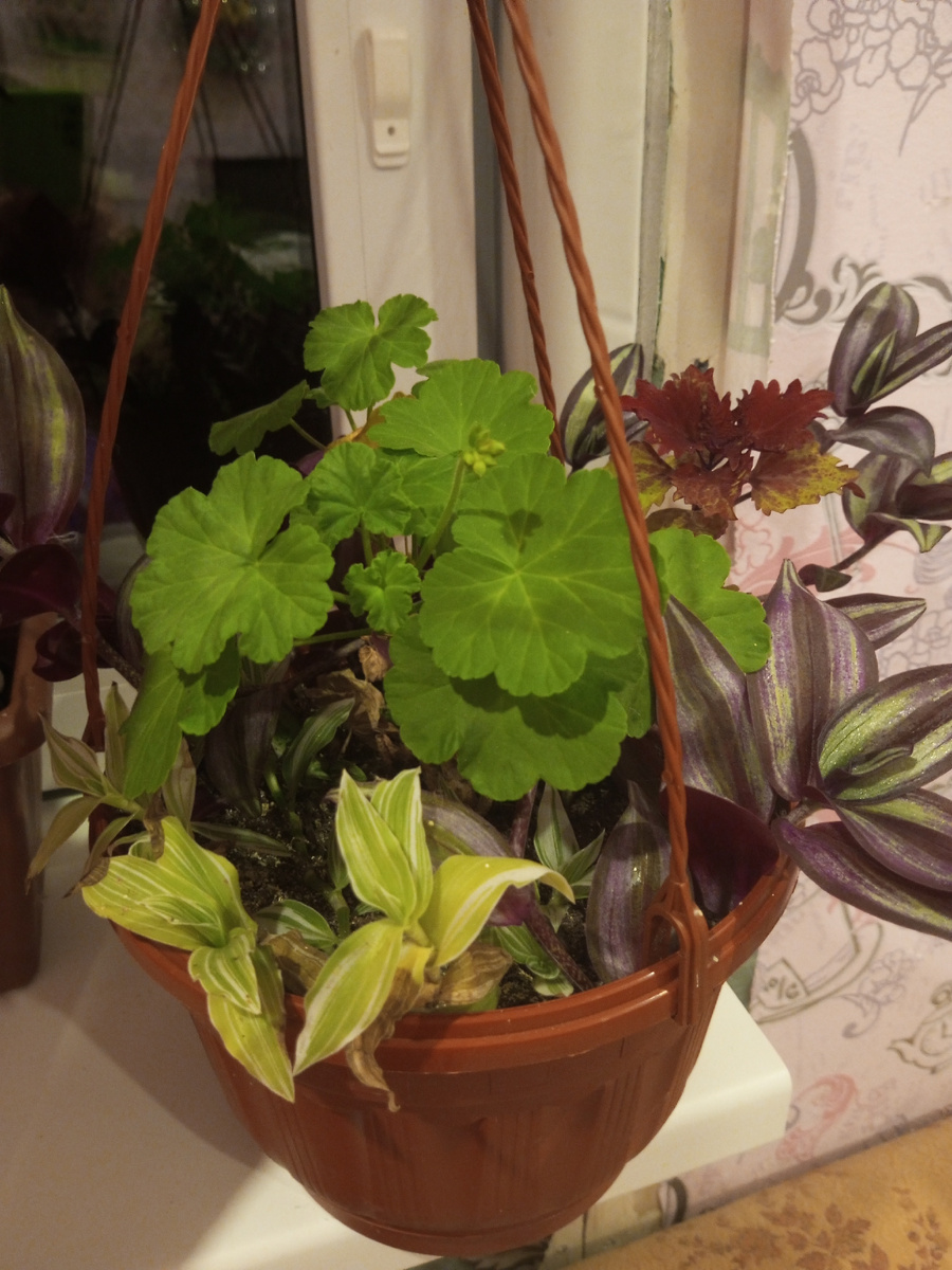 Вот и закончился весенне-летне-осенний огородный период, когда все силы и свободное от работы время уходили на выращивание помидоров-огурцов и поддержание в приличном виде сада-огорода, и теперь есть возможность (ну наконец-то, выдохнули, утерли пот, закатали по-новой рукава) уделить внимание своим любимым домашним растюшкам. Конечно некоторые из них жили летом на улице: мандарин (выращен из косточки знакомыми и отданный мне), пеларгонии, цикламены, а также какой-то цветок типа гибискус, но цветет голубыми цветами (лет 15 назад я его привезла черенком из Сочи и теперь нещадно стригу, чтобы держать в рамках приличия небольшим кустиком). В этом году в подвесной горшок сажала пеларгонию (цветет красными розочками) и традесканцию (два вида). Традесканция к концу зимы имеет чахлый вид, но зато очень быстро нарастает из черенков. Причем я традесканцию втыкала в землю даже без корней и ей это нравится. В общем пеларгония и традесканция отлично провели все лето вместе. Оказалось, что к этой к