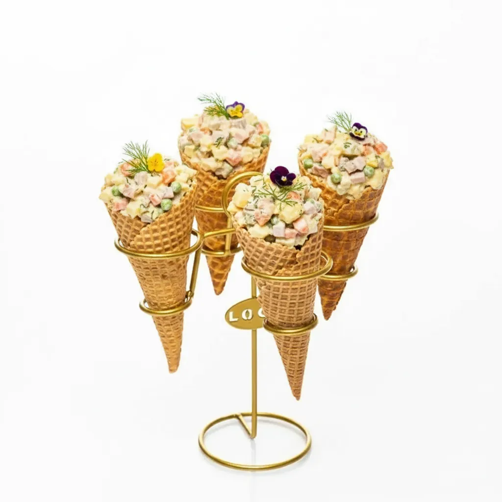 ✔ Удобство. Не нужно искать тарелку под каждый десерт — рожки, тарталетки, канапе или мини-кексы фиксируются в держателе. Подставка — мелочь, но именно такие детали создают впечатление «праздника, который всегда с тобой».