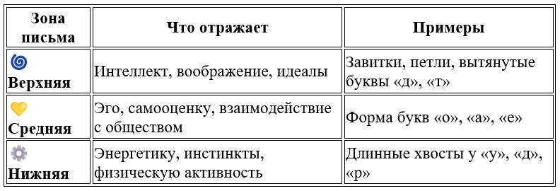 Почерк делится на верхнюю, среднюю и нижнюю зоны. Каждая отражает разные уровни человеческой психики.
