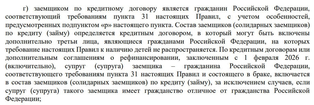 ‼️Ужесточение правил по Семейной ипотеке С 1 февраля 2026 года ипотеку по Семейной программе можно будет оформить только на обоих супругов🔴 ➡️Теперь Семейную ипотеку можно будет оформить только при участии обоих супругов как созаемщиков. ➡️"Донорская" ипотека рискует больше не существовать. Подробнее ознакомиться с Решением Министерства финансов можно тут. Ставь 😢 , если неожиданно.