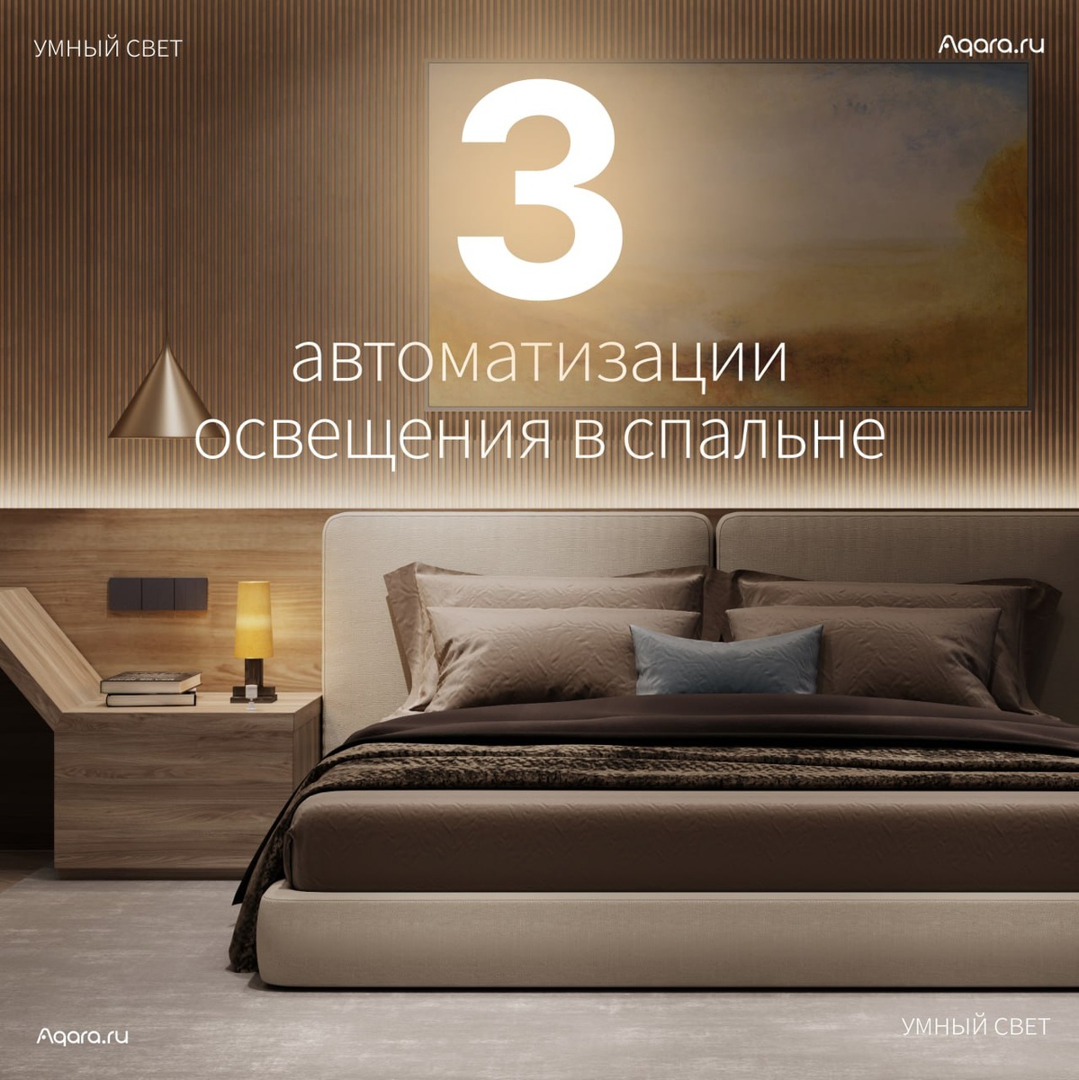 Автоматизации освещения в спальне В спальне с устройствами Aqara можно создать несколько сценариев освещения. Умные светильники позволяют менять атмосферу комнаты в зависимости от времени суток и ваших потребностей — от мягкого фонового света до яркого рабочего освещения. Это помогает создать комфортные условия для сна, отдыха или даже работы. Идеи автоматизаций: Пробуждение LED-лента установлена вдоль изголовья кровати — она мягко подсвечивает стену и создает эффект рассвета. Потолочная лампа в центре комнаты включает теплый свет. Точечный светильник над кроватью остается выключенным. Такое расположение источников света создает мягкую атмосферу для пробуждения, не раздражая глаза. Когда: время 6:45 И: датчик Aqara FP2 не зафиксировал присутствие в комнате Тогда: LED-лента вдоль изголовья включается постепенно, потолочная лампа Т1 включает теплый свет Рабочий день Точечный светильник расположен над рабочей зоной. LED-лента включена, а лампочка T1 выключена, чтобы свет не был слиш