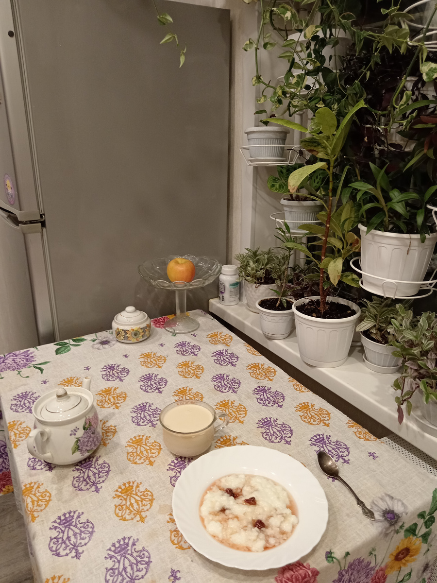 Пока чайник миролюбиво побулькивал, на завтрак сварила молочную рисовую кашу. Со сливочным маслом и клубничным вареньем очень вкусно и полезно.