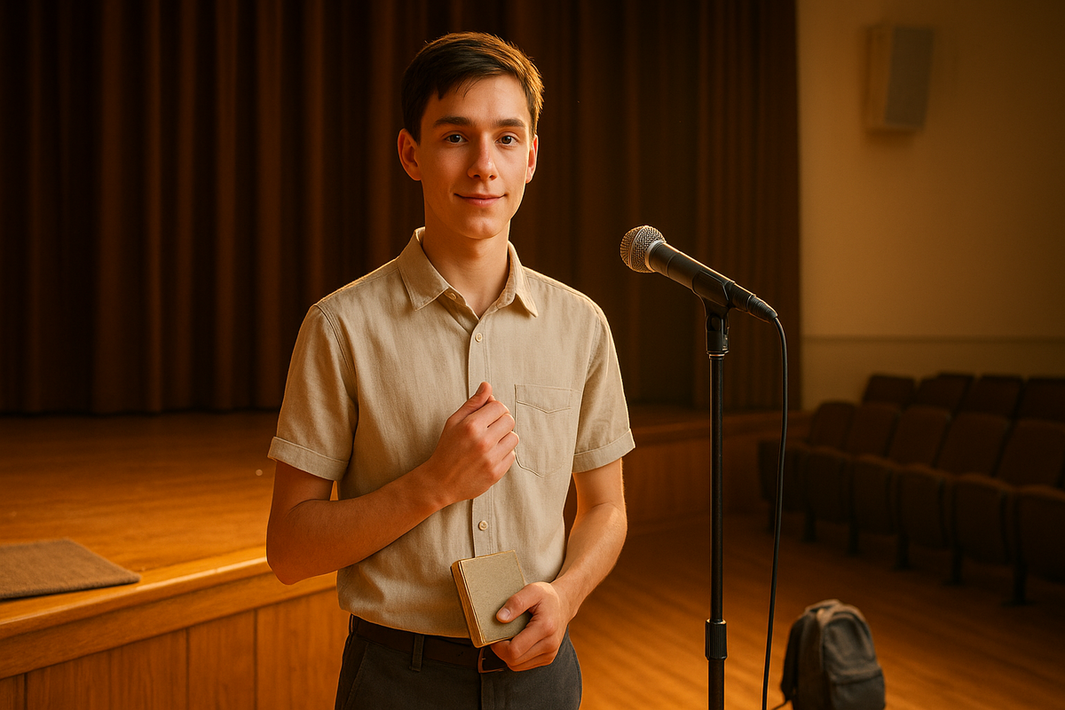 Генеральная репетиция шуршала чужими платьями и хрипела кабелями. Свет был тёплый и пыльный; взвешенные в лучах крупинки напоминали снег из старого кино. Я подошёл к ведущему: «С меня начни». Голос прозвучал ровно, как у человека, у которого есть план, хотя у меня был только жест. Пальцы холодные, как февральские перила, но в лунке ногтя подушечка большого пальца нашла знакомую выемку. Если не сейчас — когда?