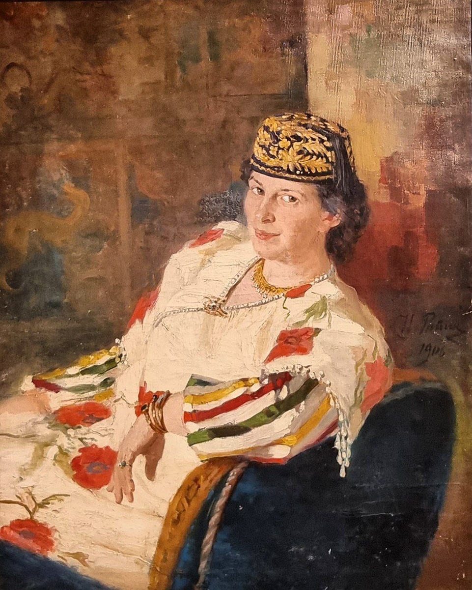 Репин Илья Ефимович Портрет Мары Константиновны Олив (1870-1963), в первом браке Мамонтовой, во втором Свербеевой 1906, холст, масло, 90х72 Тюменское музейно-просветительское объединение Портрет Мары Олив как нельзя лучше раскрывает особенности репинского творчества начала XX века. В процессе создания портрета мастер, увлеченный натурой, зачастую испытывал чувство влюбленности в свою модель. Это чувство и живописный темперамент позволяли ему «схватить сущность» человека. Мара пленяла яркой внешностью, искрометным юмором, свободной манерой общения. Художник создал портрет на одном дыхании. Артистизму героини вторит виртуозная манера письма. Широко и свободно написан восточный наряд модели, радующий глаз сочными красками. Верно найденная композиция подчеркивает раскованность и подвижность ее натуры. Замечательно прописано лицо женщины: лукавые глаза с хитринкой, кокетливая улыбка — все дышит жизнью ( из мат-лов Русского музея).