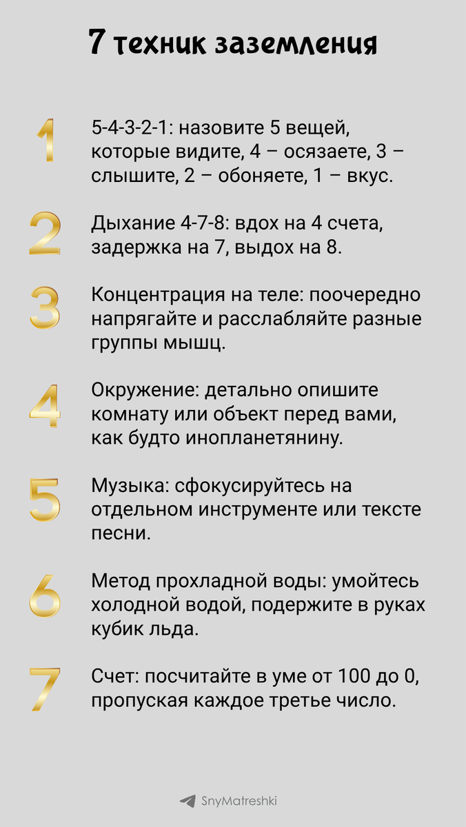 Простые упражнения, чтобы вернуть себя в "здесь и сейчас" во время тревоги, паники или флешбэков. Заземление "перезагружает" нервную систему, выводя ее из состояния гипервозбуждения. Выберите одну технику, которая вам откликнулась, и потренируйтесь в спокойном состоянии, чтобы использовать ее в стрессе. Поддержать автора Александра Бóгдан,