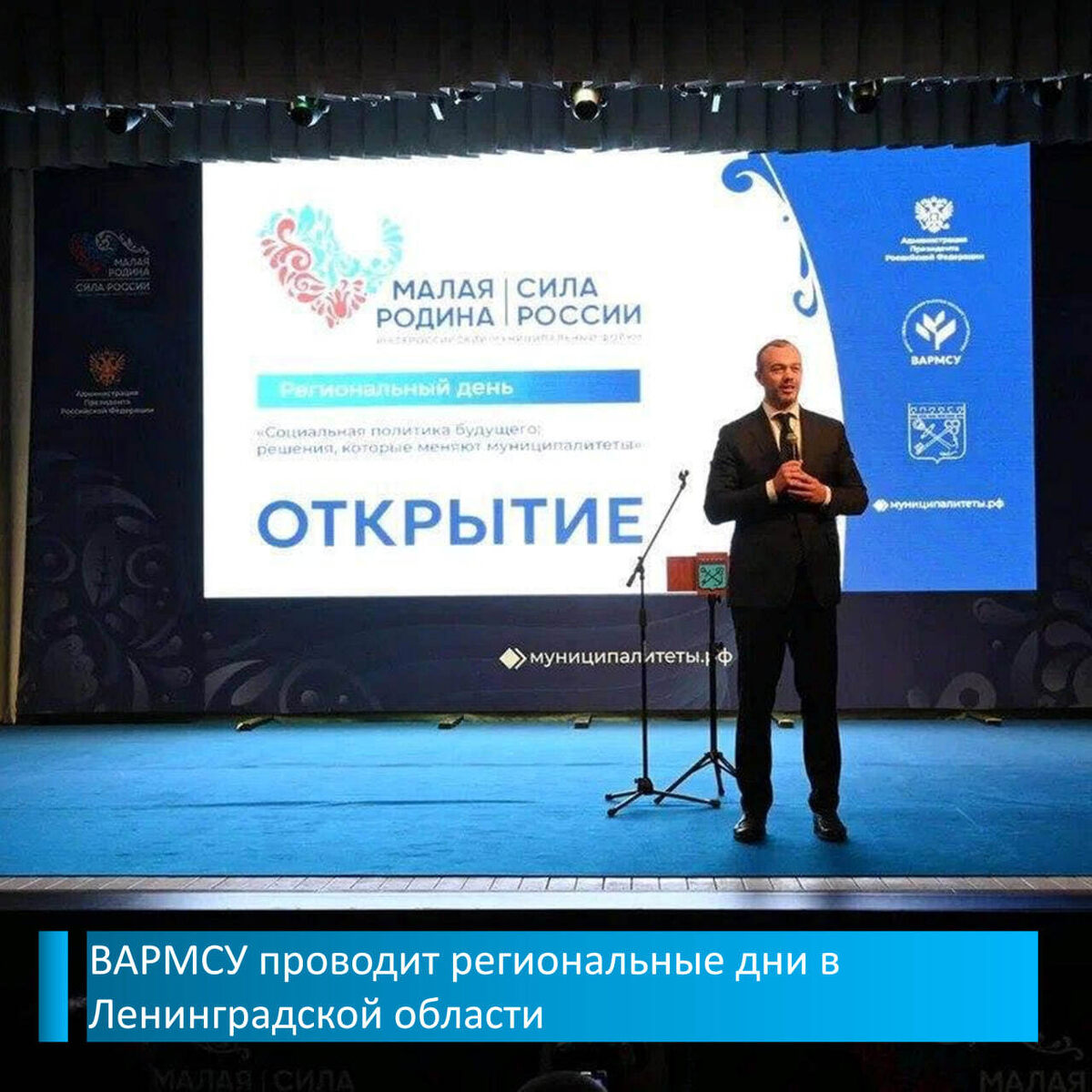 Региональные дни III Всероссийского муниципального форума «МАЛАЯ РОДИНА – СИЛА РОССИИ» в Ленинградской области Главная тема встречи – «Социальная политика будущего: решения, которые меняют муниципалитеты». Участников поприветствовали заместитель полпреда Президента РФ в СЗФО Роман Балашов, губернатор Ленинградской области Александр Дрозденко, заместитель начальника Управления Президента РФ по внутренней политике Евгений Грачев и сопредседатель ВАРМСУ Ирина Гусева. «В основе любых изменений – потребности людей, а муниципальная власть, как самая близкая к жителям, должна вести максимально открытый диалог. Темы, которые мы выбрали в рамках проведения региональных дней, не случайны. Ленинградская область динамично развивается. Социальные объекты, которые главы смогут посмотреть в ходе работы форума, покажут имеющиеся в регионе успешные практики и возможности», - сказал Евгений Грачев. Программа включает лекции, сессии и круглые столы по вопросам демографии, сохранения молодёжи, ком