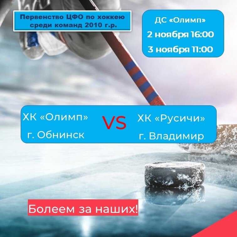 🏒2 ноября в 16:00 и 3 ноября в 11:00 в ДС «Олимп» в Обнинске состоятся хоккейные матчи. Команда «Олимп» (дети 2010 г. р., под руководством тренера Линкевича Даниила Станиславовича) будет принимать хоккеистов из команды «Русичи» (Владимир).