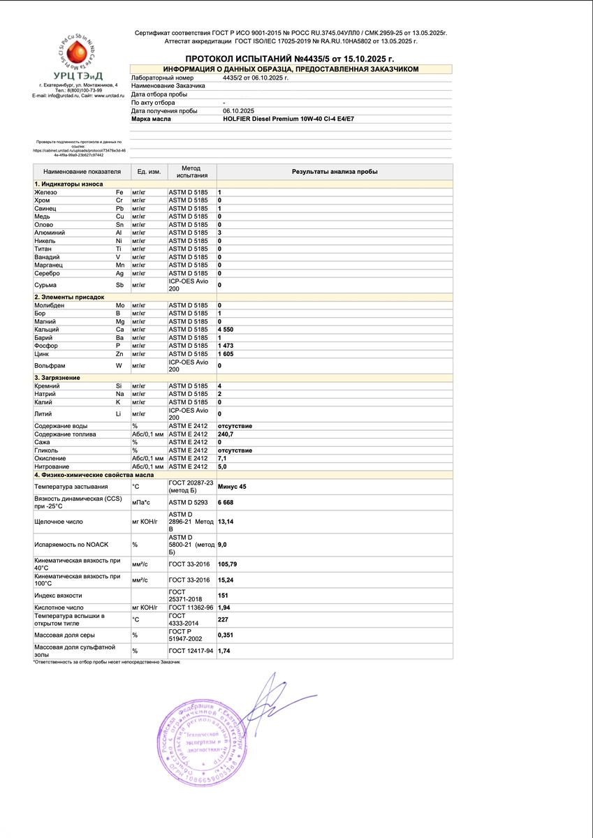 HOLFIER Diesel Premium 10W-40 CI-4 / E4 / E7, подтвердивших его высокие эксплуатационные характеристики и соответствие строгим международным стандартам. Физико-химические показатели: Моторное масло HOLFIER Diesel Premium 10W-40 CI-4 / E4 / E7 полностью соответствует заявленным параметрам SAE и международным стандартам API/ACEA. Продукт сочетает в себе высокую термостабильность, отличные моющие свойства и надёжную защиту двигателя в любых условиях эксплуатации. На данный момент действует дополнительная скидка на вязкость 10W-40 CI-4 / E4 / E7.
