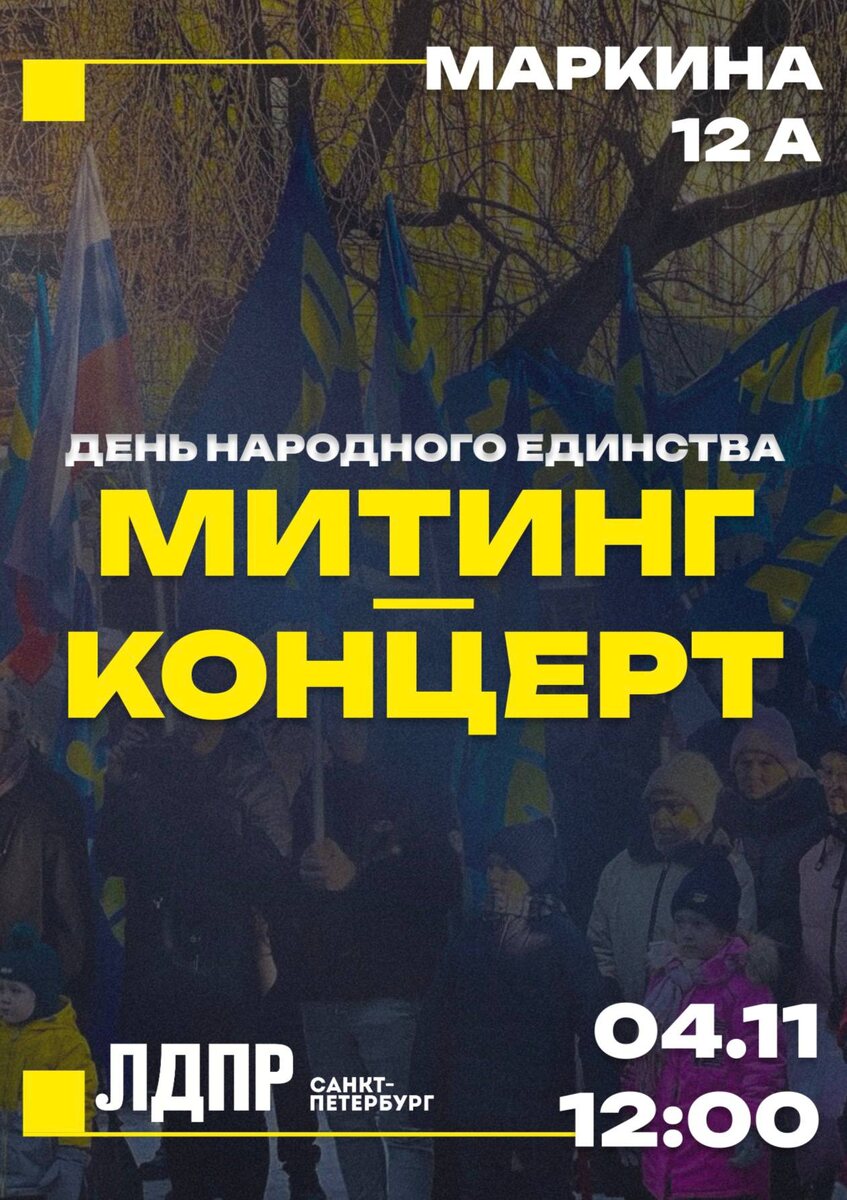 ♥ Приглашаем на митинг-концерт ЛДПР в честь Дня народного единства 4 ноября в 12:00 по адресу ул. Маркина 12А состоится праздничное мероприятие Санкт-Петербургского регионального отделения ЛДПР. Вас ждёт яркий день, наполненный музыкой, добрыми словами и настоящим чувством единства! На сцене - выступления депутатов и активистов ЛДПР, концертная программа, интересные гости и, конечно, отличное настроение для всех участников. Этот праздник напоминает нам, что сила России - в её народе, в нашем единстве и взаимном уважении. Приходите всей семьёй, приводите друзей и близких - давайте вместе отметим этот важный день в атмосфере радости и патриотизма! Вместе - за сильную и свободную Россию! 🔗 Мы ВКонтакте 🖥 Сайт ЛДПР | Санкт-Петербург