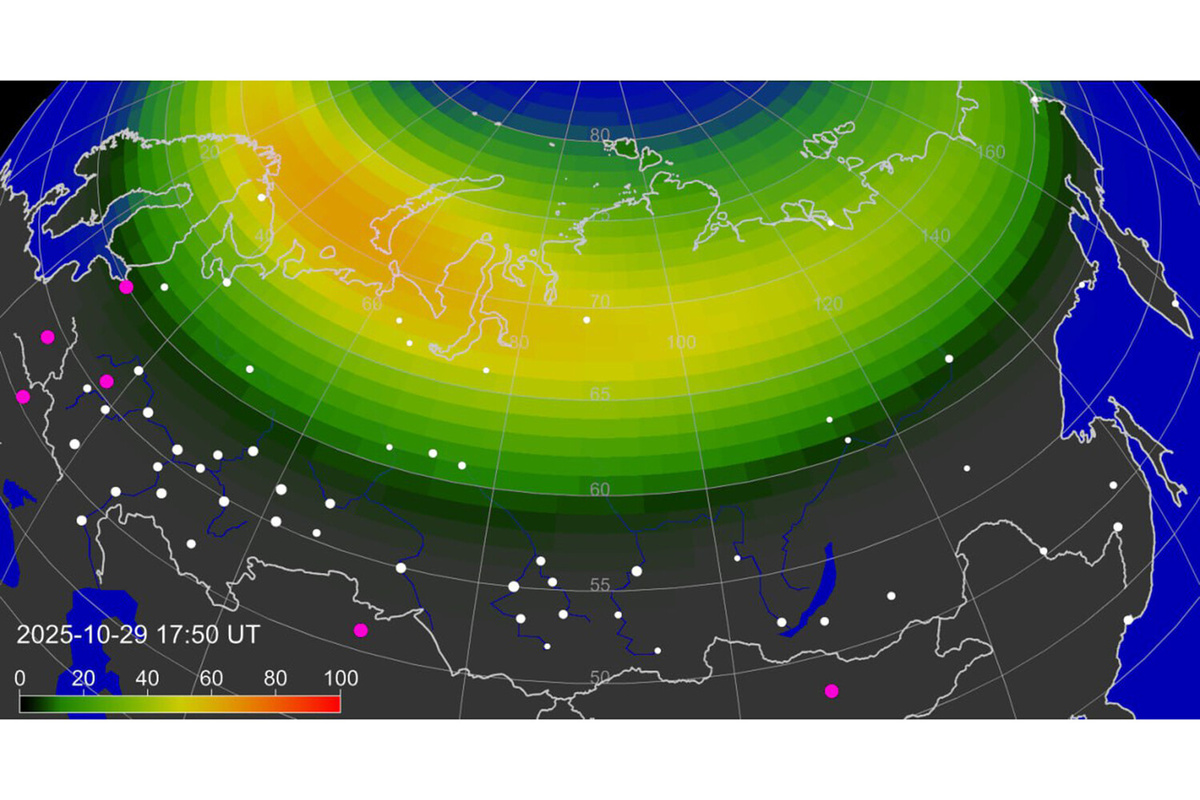 Газета.ru со ссылкой на Лабораторию солнечной астрономии ИКИ РАН сообщает, что над северными и северо-западными регионами России наблюдается полярное сияние. Явление вызвано умеренной геомагнитной нестабильностью, сохраняющейся второй день. Хотя магнитных бурь сейчас нет, риск их возникновения сохраняется в течение суток. Наблюдать сияния можно в Мурманской и Архангельской областях, Карелии, Салехарде, Новом Уренгое и Коми. Повышена вероятность увидеть сияние в Санкт-Петербурге и Ленинградской области, хотя в центральных регионах России наблюдения пока невозможны. Специалисты отмечают, что из-за погодных условий во многих местах сияние может быть слабо видно. Для лучшего наблюдения рекомендуется направлять камеру телефона или фотоаппарата на северное небо.