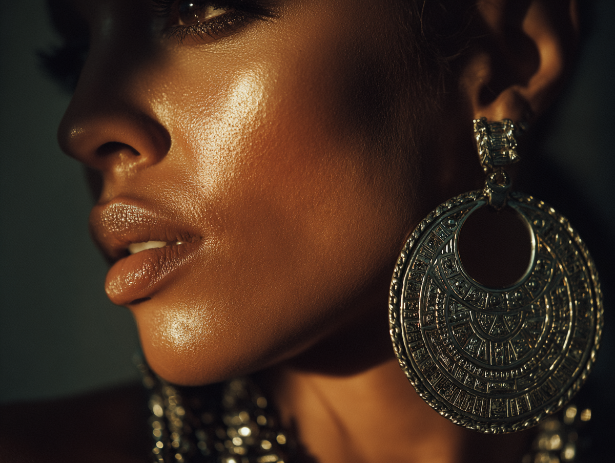 Функция: чёткая демонстрация статуса. Серьги в форме полумесяца — знак власти и принадлежности к высшей касте. Бронза, золото, сложная зернь — отголоски этой эстетики легко увидеть и в современных этно-коллекциях. Серьги — часть идентичности со дня рождения. Ритуалы проколов ушей связаны с защитой жизненной энергии. Позже — массивные украшения для танцовщиц и женщин королевских родов.