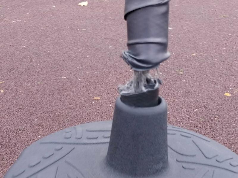 – Парковые качели. Здесь повреждены стенки МАФа деформированы крепления;