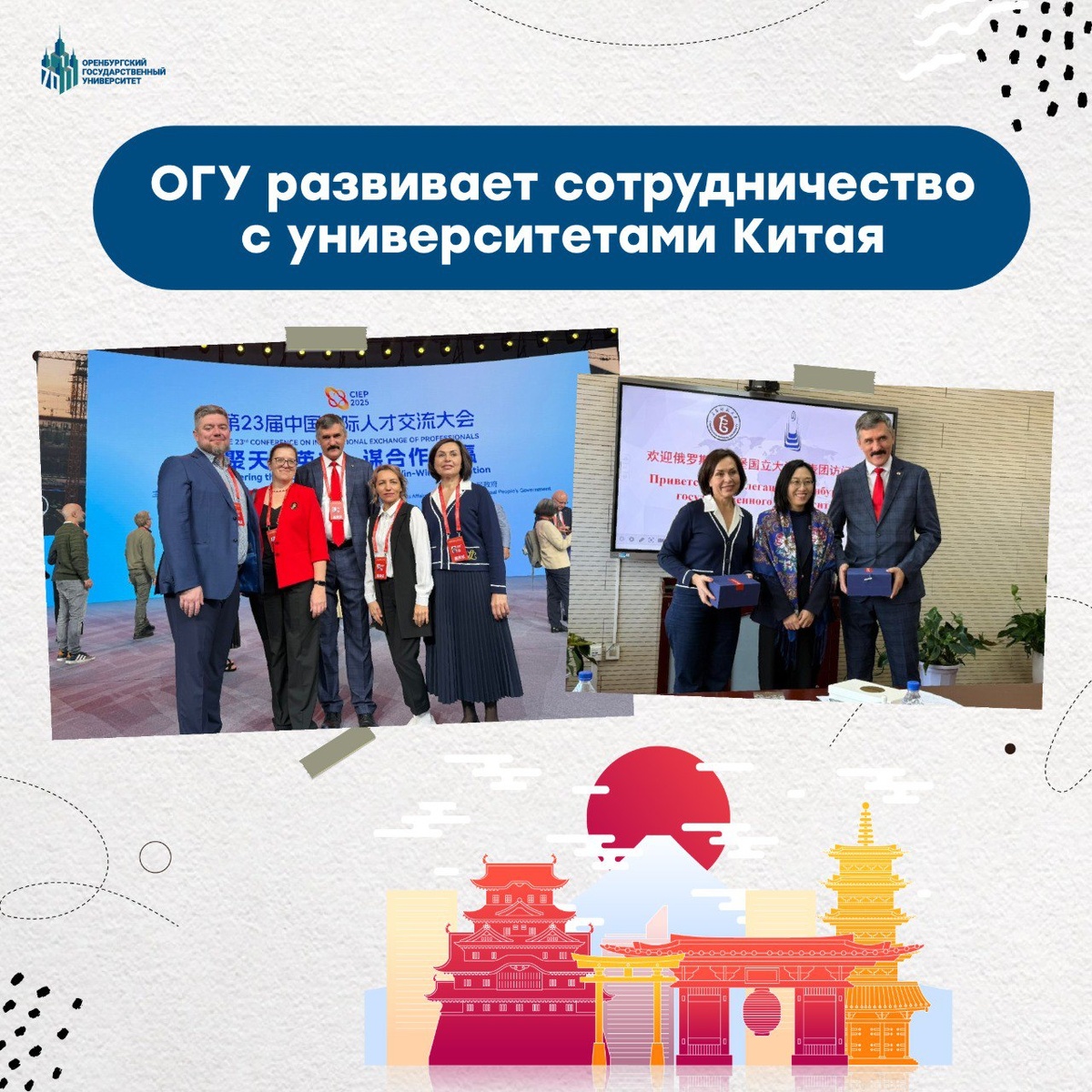 ОГУ развивает сотрудничество с университетами Китая 🇷🇺🇨🇳 В Китайской Народной Республике прошла 23-я Международная конференция по обмену квалифицированными кадрами. Площадка объединила более 5000 экспертов, ученых, лидеров бизнеса и власти из 150 стран мира. К событию присоединилась делегация ОГУ во главе с ректором Сергеем Мирошниковым. Представители вуза поделились опытом работы и результатами исследований в стратегически важных направлениях ✨ В делегацию Оренбургской области вошли начальник отдела развития международного сотрудничества и образования ОГУ Людмила Докашенко, начальник отдела цифровых образовательных платформ Денис Парфенов, директор ИОН Виктория Мороз, доцент кафедры английского и китайского языков Надежда Иноземцева, директор лицея № 5 Елена Иванова. Насыщенная программа конференции позволила специалистам воочию оценить уровень научно-технологического развития КНР. Участники побывали на инновационных предприятиях Шанхая и Чанчуня, пообщались с руководством вед
