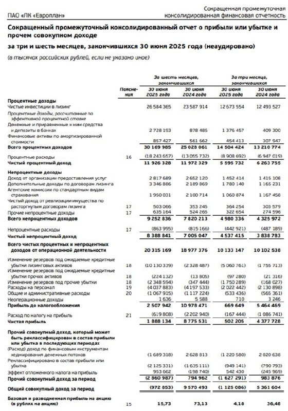 📊 Европлан. Отчет МСФО за 1 полугодие 2025 г. На дне. Лизинговая компания «Европлан» начала свою деятельность под названием Delta Leasing в 1999 г. в Ростове-на-Дону. Потом переехала в Москву и была куплена фондом Baring Vostok, который переименовал ее в «Европлан» и к концу нулевых сделал ее лидером в автолизинге России. В 2015 г. 100% группы, в которую, помимо лизинговой компании, входил одноименный банк, купили акционеры Бинбанка, создавшие группу «Сафмар». В декабре того же года Европлан продал в ходе IPO на МосБирже 25% минус одна акция за 3,27 млрд руб по цене 570 руб за штуку. Рыночная капитализация составила 13 млрд руб. Через год — SPO, денежная часть которого составила 20,8 млн акций (18,6%) за 15 млрд руб по цене 720 руб за штуку, а неденежную часть внесли контролирующие акционеры в виде 100% акций НПФ «Са