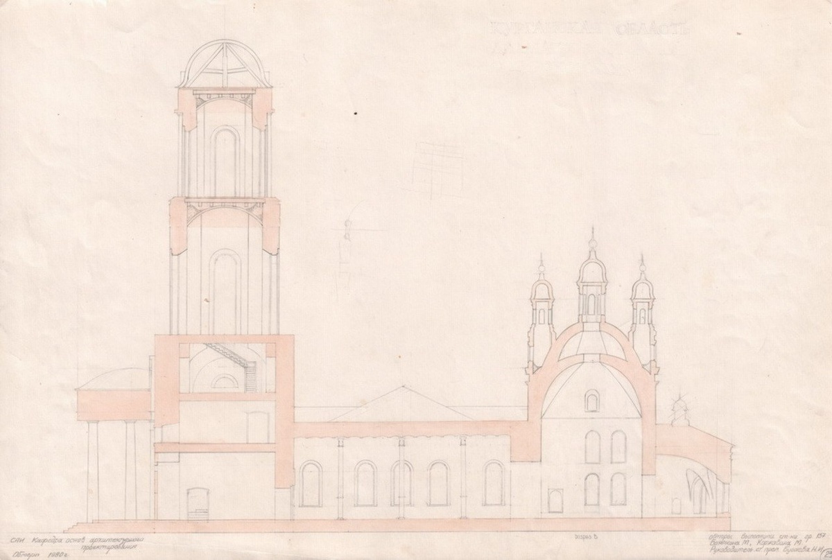 По притокам реки Исеть (Церкви). Материалы обмерной практики. Лист 23. Церковь Иоанна Предтечи с. Широковское. Разрез | 1980 г. Обмерочная практика. По притокам Исети. Выполнили студенты САИ гр. 137: М. Бояркина, М. Коржавина, С. Кириллов, С. Поташин, В. Халитов, Ю.М. Хренова. Руководитель Н.И. Бугаева. Свердловск, 1980 г. Источник: Музей архитектуры и дизайна Федерального государственного бюджетного образовательного учреждения высшего образования "Уральский государственный архитектурно-художественный университет имени Н.С. Алфёрова" https://vk.cc/cQPOkq