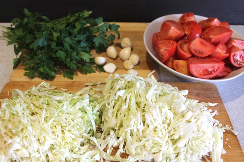 Помидоры нарезаем крупными дольками, капусту шинкуем. Укладываем в