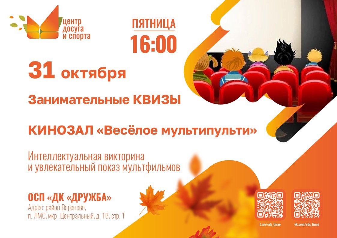 🎉 Мульт-квиз и кинопоказ: «Весёлое мультипульти»! 🎉 Библиотека ОСП «ДК «Дружба» приглашает всех любителей мультфильмов на увлекательное событие в рамках клуба любителей кино и ТВ «Диалог»! 🎬🧠 Вас ждёт игровая программа «Занимательные КВИЗЫ» и кинозал «Весёлое мультипульти», где мы окунемся в мир добрых отечественных мультфильмов! 🌟 Программа мероприятия сочетает интеллектуальную викторину и увлекательный кинопоказ, создавая идеальный формат для активного и культурного досуга. Давайте проведем это время весело и с пользой! 🗓️ Когда? 31 октября (пятница) ⏰ Во сколько? 16:00 📍 Где? ОСП «ДК «Дружба», п. ЛМС, мкр. Центральный, д. 16, стр. 1, район Вороново. Ждём вас! ❤️ #новостивороново #анонсывороново #новоститинао #анонсытинао