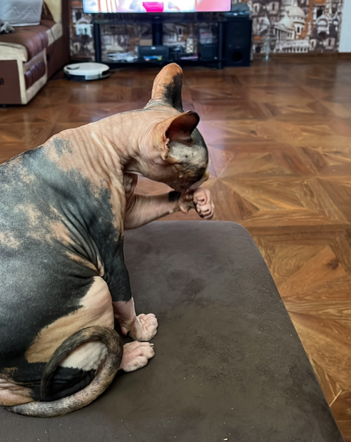 Самая узнаваемая особенность сфинкса — полное отсутствие шерсти или очень тонкий, мягкий пушок, создающий ощущение бархата при прикосновении. Их кожа часто покрыта легкими складками, а ушки — крупные и широко расставленные. Глаза у сфинкса выразительные, миндалевидные, цвета могут варьироваться — от зелёных до золотистых. Характер и поведение