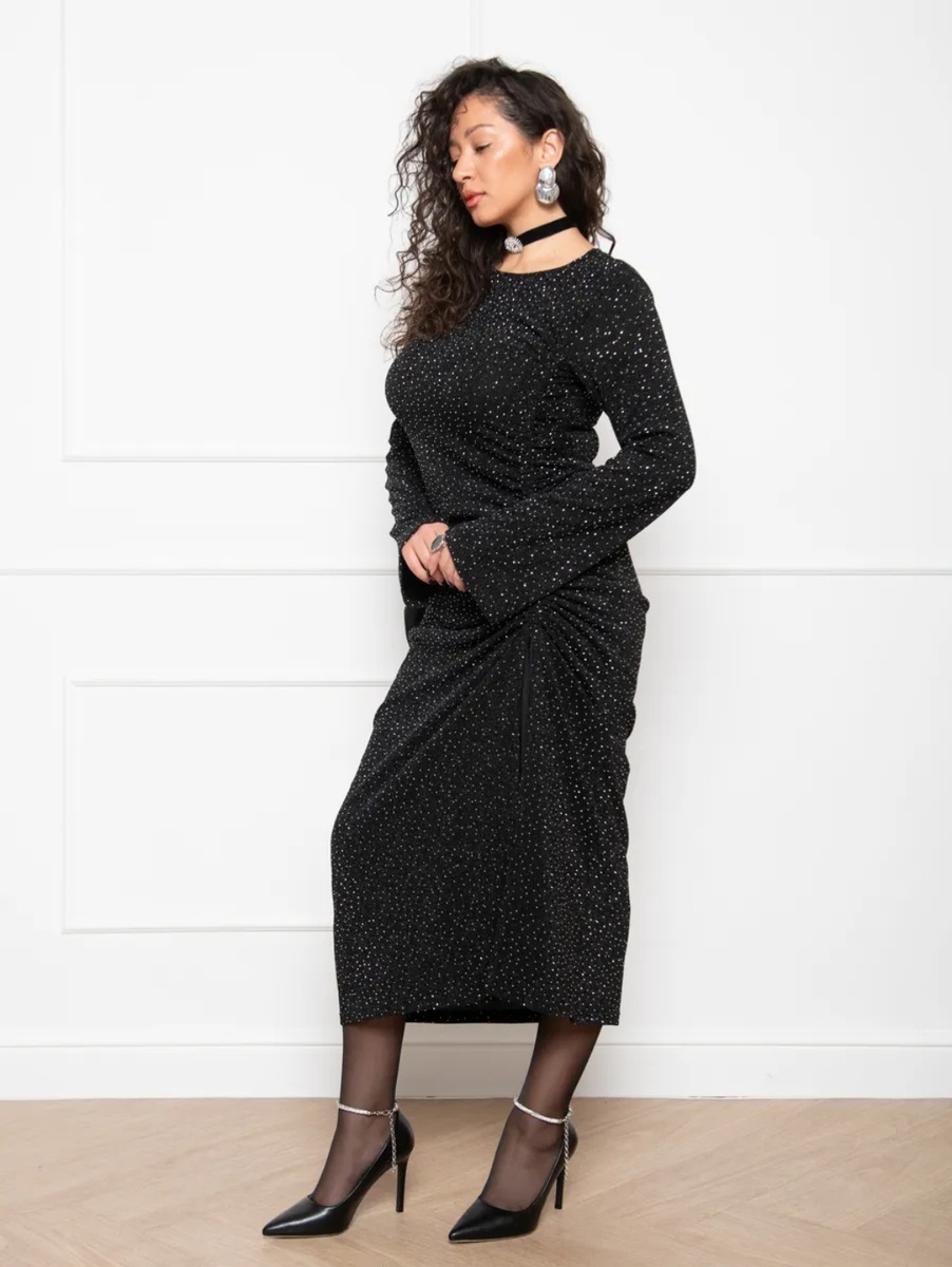 Люрекс и стразы делают этот наряд по-настоящему праздничным, а трикотажный материал мягко облегает фигуру, обеспечивая комфорт на протяжении всего вечера. Платье особенно актуально для новогодних праздников и корпоративов, где хочется выглядеть безупречно.