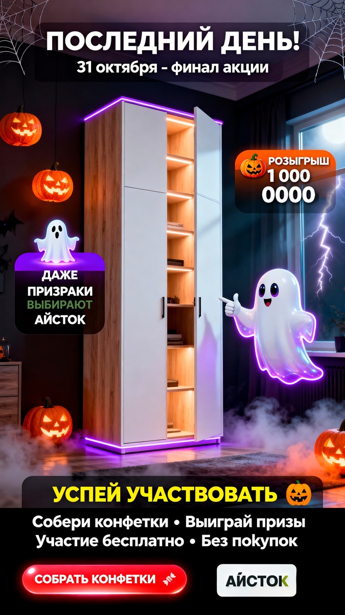 👻 ПРЕДПОСЛЕДНИЙ ДЕНЬ! Акция заканчивается. Времени мало. ⏰ Сегодня 30.10 - предпоследний день ⏰ Завтра 31.10 - финал ⏰ 01.11 - розыгрыш ПРИЗЫ: 💰 Техника на 1 000 000₽ 📻 5 Яндекс Станций 🎫 Сертификаты 10 000₽ 🔥 Скидки до -28% УЧАСТИЕ БЕСПЛАТНОЕ БЕЗ ПОКУПОК Собери конфетки за 30 секунд: https://айсток.рф/halloween Даже привидения участвуют. Ты чего ждёшь? 😈 АЙСТОК | СПб | Мебель на заказ