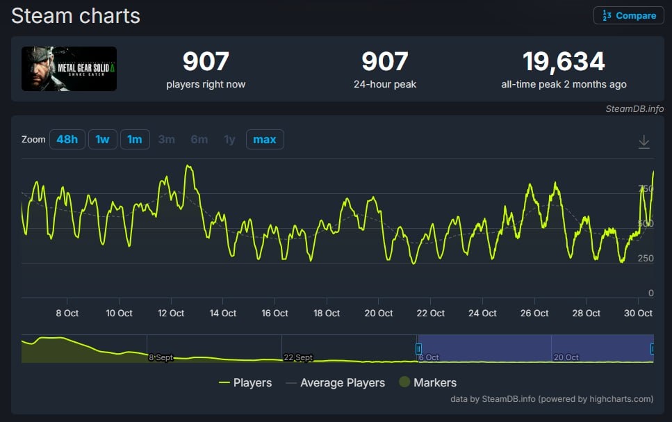 В ответ на пост Мультиплеер ремейка Metal Gear Solid 3: Snake Eater, по крайней мере в Steam, оказался никому не нужен. Онлайн игры с начала октября остался прежним — да и 12 числа он даже был выше, чем за сегодня.