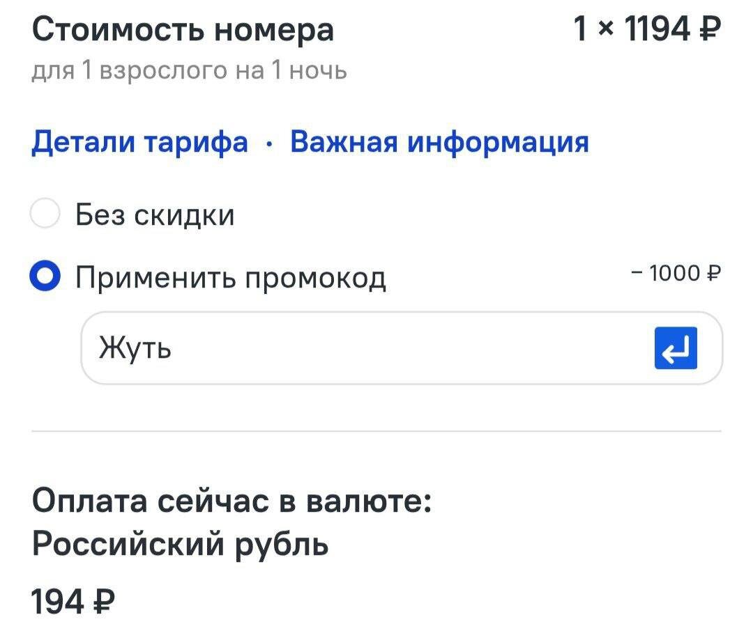 Промокод ЖУТЬ - скидка 1000 от 1001₽ на бронирование
