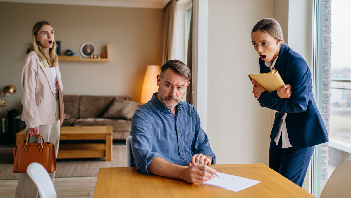 Ольга не выдержала и шагнула в гостиную. Николай и женщина в строгом деловом костюме сидели за столом с разложенными бумагами. Увидев жену, муж вздрогнул и побледнел.