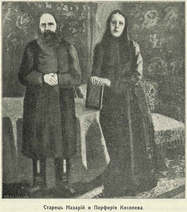 Порфирия Ивановна Киселева, которую сектанты именовали «богородицей». Русские газеты дают следующие интересные сведения о личности Порфирии Киселевой….«Богородица», говорит «Русь», завела целую систему воздействия на своих последователей. Она принимала посетителей поодиночке в совершенно темной комнате, сидя в углу под иконами на троне, в хитоне и тунике (каковою изображается Богородица на иконах); в углу, за троном, устраивались электрические лампочки, которые, окружая «богородицу» разноцветным сиянием, давали поразительный эффект».
