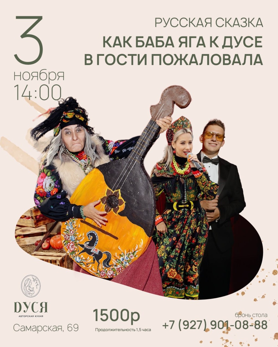 Русская сказка «Как Баба Яга к Дусе в гости пожаловала» ☀️ 3 ноября 14:00 | Ресторан авторской кухни Dуся «Dуся» приглашает на театральное представление для всей семьи: Гостей ждут сказочные герои — Краса-Девица Дуся, Баба Яга и Добрый молодец, которые устроят настоящий праздник с народными забавами, весёлыми конкурсами и музыкой в русском стиле. В программе: – Песни и танцы, игры от ведущего, подарки Угощения от ресторана: - Ароматная уха по-домашнему, Горячие напитки и угощения для всех гостей 📌 Стоимость участия для всей семьи — 1500 рублей 🌐 Забронировать: @sofonoff ул. Самарская, 69 + 7 (927) 901-08-88